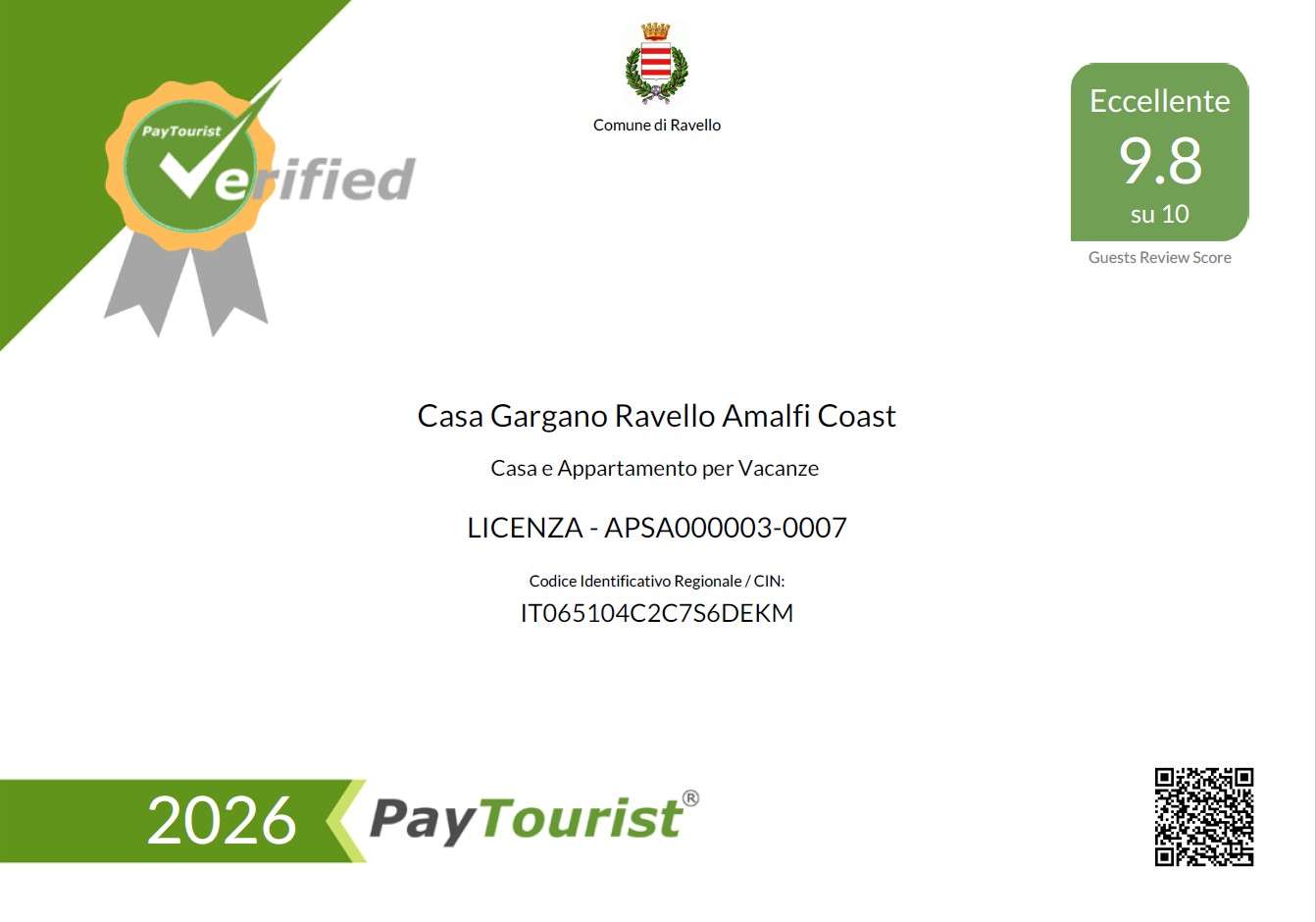 Certificazione di Qualità e Punteggio Annuale 2026 PayTourist – Comune di Ravello